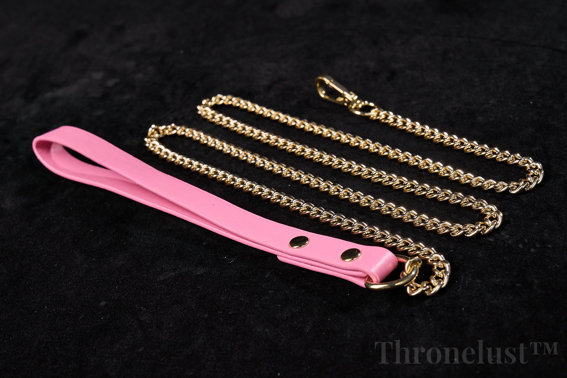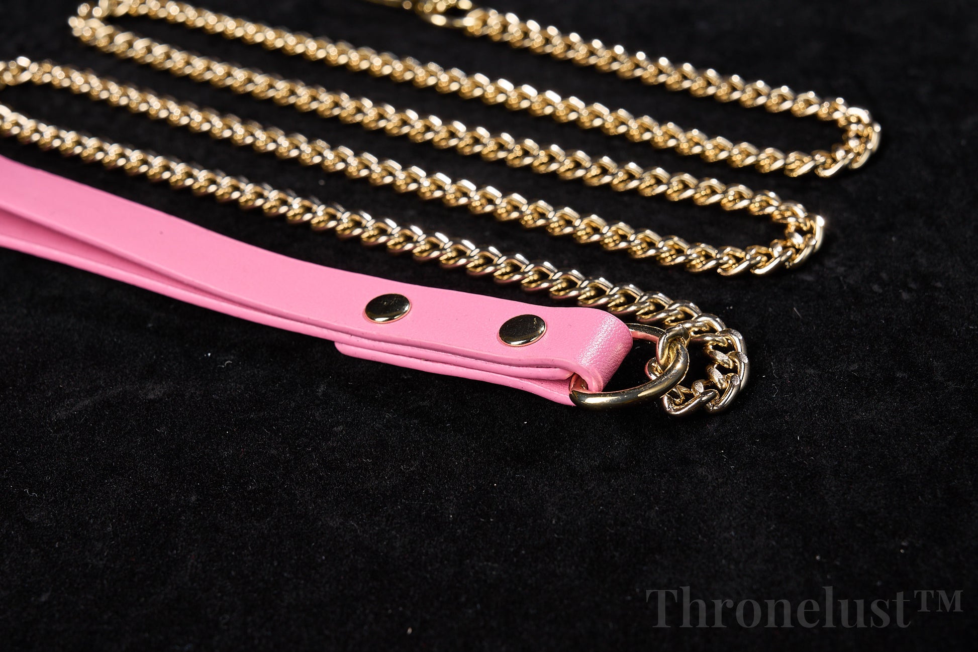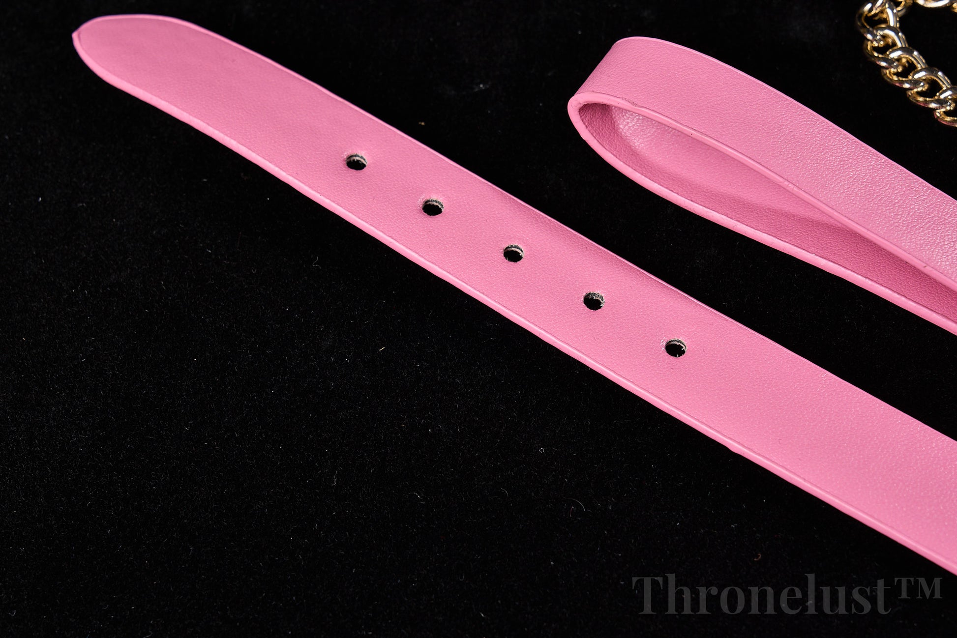 The swivel clip chain leash ensures smooth control, while the PU wrist loop offers a secure grip. With its pink finish and stylish design, this collar set doubles as a fetish accessory and a statement piece.