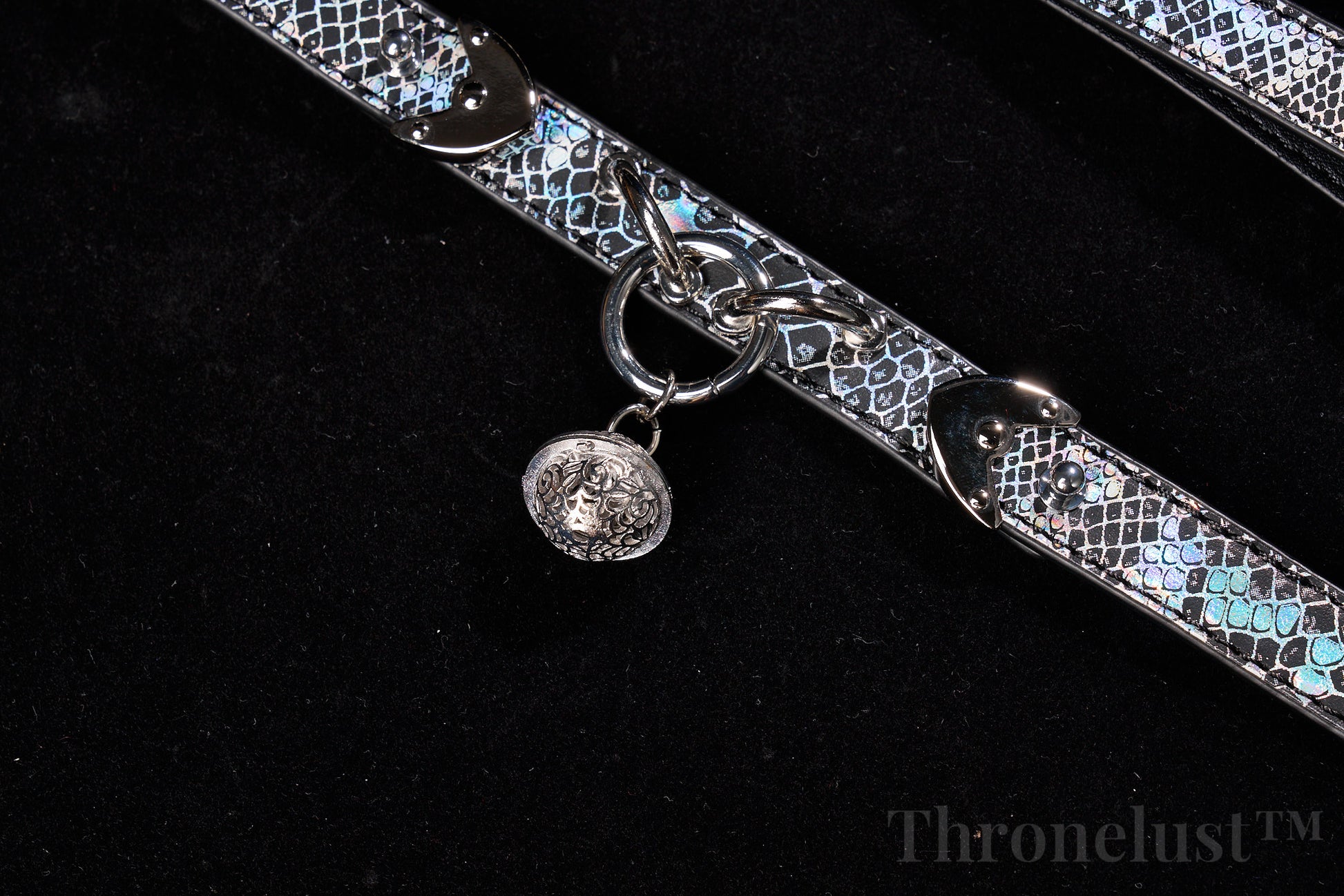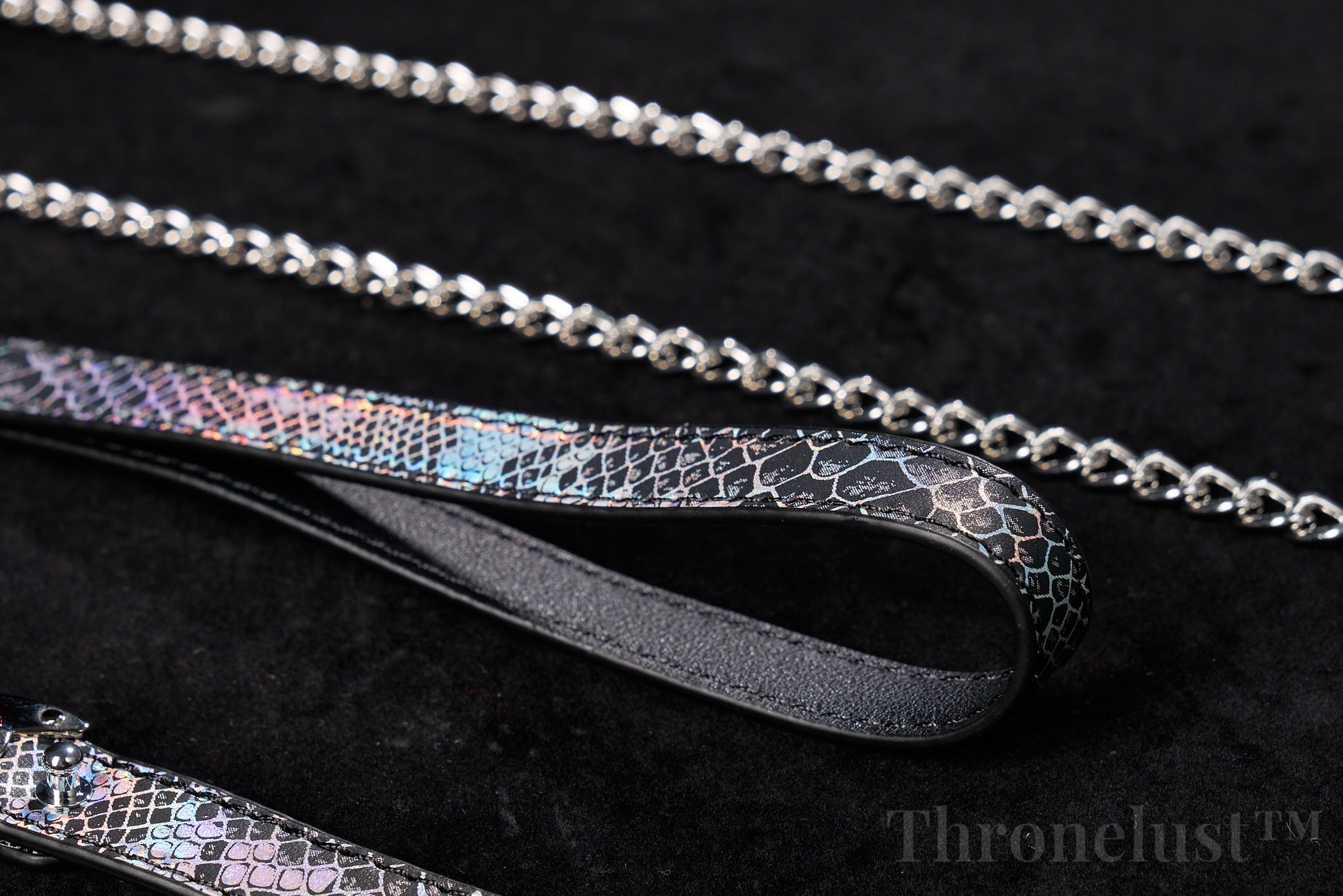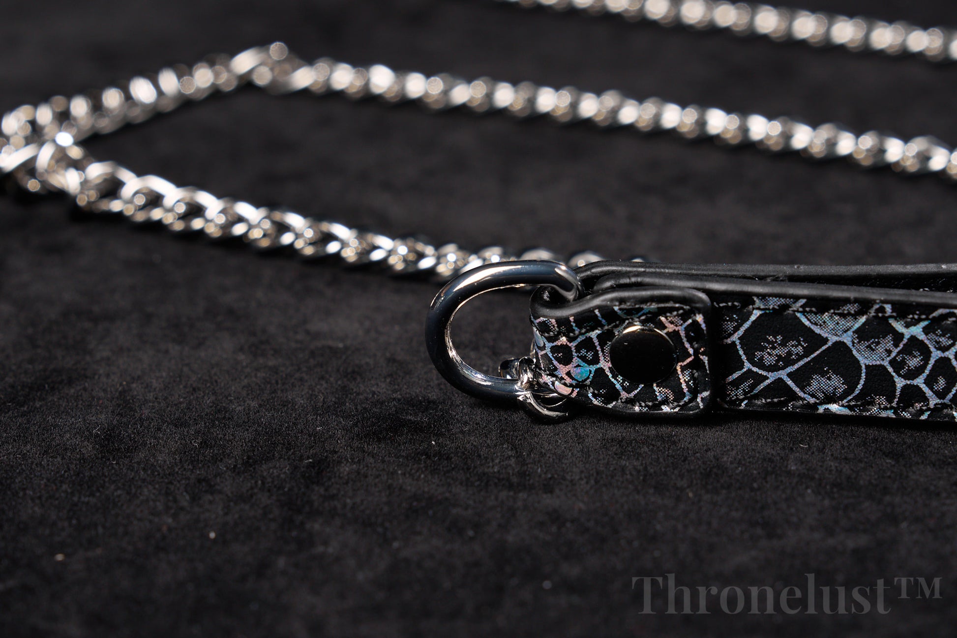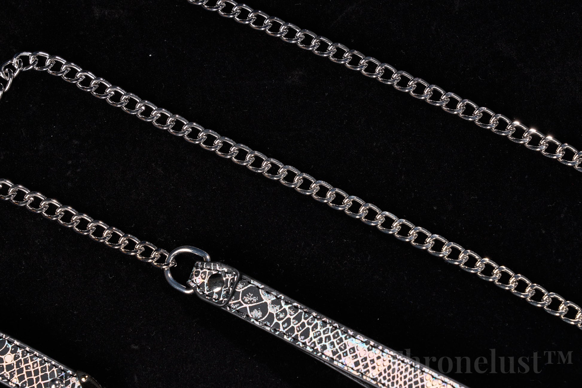 The Thronelust™ Snake-Pattern Collar with Silver Chain Leash blends style and dominance in one accessory.