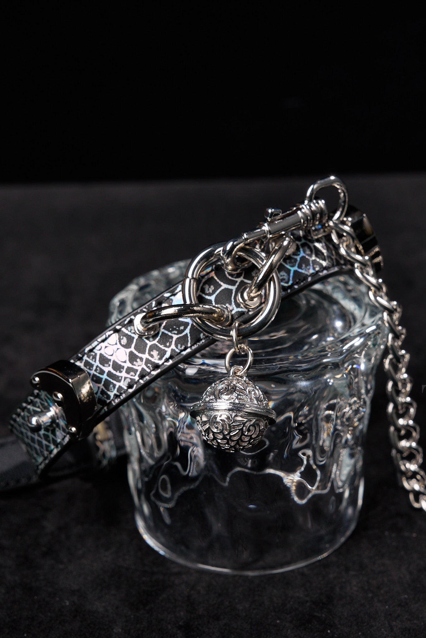 • Package Includes: 1 × Snake-Pattern Collar, 1 × Silver Chain Leash